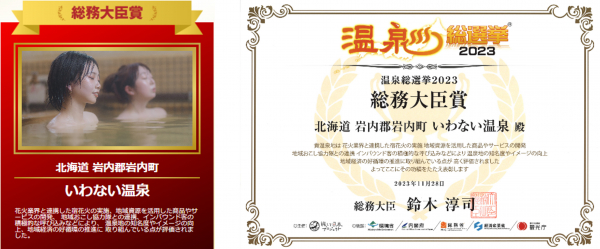 5省庁(環境省、内閣府、総務省、経済産業省、観光庁)の後援で観光地の活性化プロジェクトを実施している温泉総選挙(主催:旅して日本プロジェクト、運営事務局:一社)日本エンパワーメントコンソーシアム、本社:東京都渋谷区、温泉総選挙総合プロデューサー/社会起業家:山下 太郎)は、11月28日開催された『温泉総選挙2023』表彰式にて、温泉地の取り組みを評価する省庁賞4賞、特別賞8賞を発表し、総務大臣賞は「いわない温泉(北海道岩内郡岩内町)」が受賞いたしました。