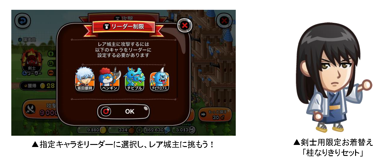 「バトル」から「ひとりで」または「みんなで」を選び、「攻撃」を選択すると、ランダムでレア城主が出現する「レア城主イベント」を開催いたします。まれに「特別な城」と遭遇し、条件をクリアすると剣士用限定お着替え「桂なりきりセット」がもらえます。