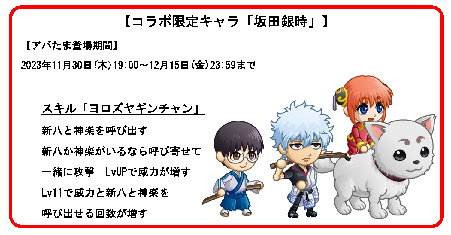 TVアニメ『銀魂』とのコラボイベント開催を記念して、「コラボのアバたまチケット」最大10枚などがもらえる「ログインボーナス」を開催いたします。コラボのアバたまチケットを使ってコラボ限定キャラを手に入れましょう!
