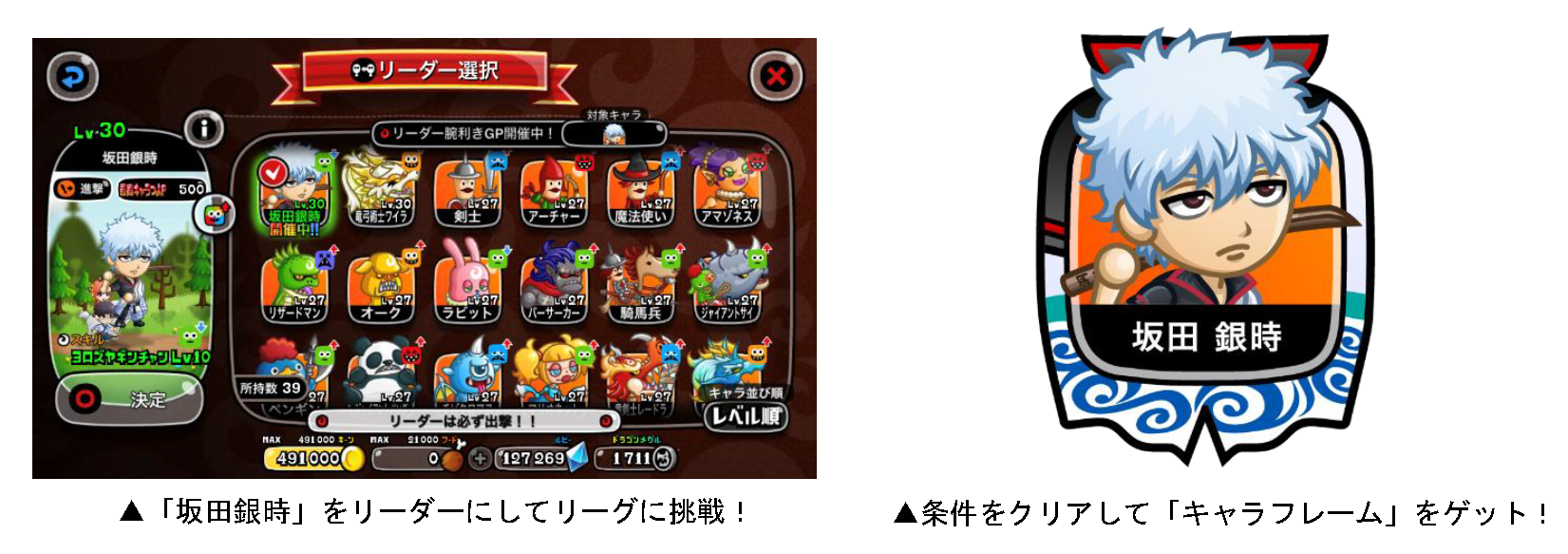 コラボ限定キャラ「坂田銀時」をリーダーにしてリーグに挑む「リーダー腕利きGP」を開催いたします。バトルに勝利してより多くの「キャラフレP」を獲得したランキング上位者や条件を達成した方には、コラボ限定「キャラフレーム」が贈られます。