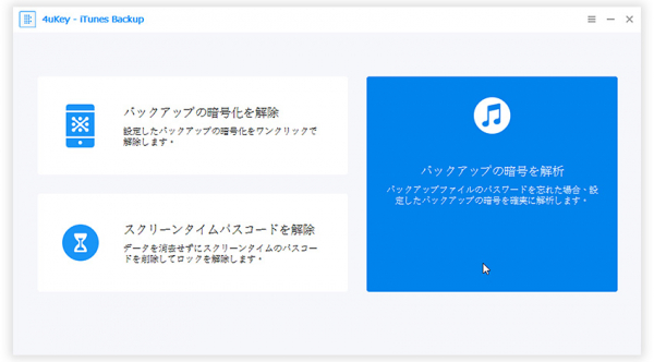 もっと簡単にiTunesバックアップパスワードを解除したいなら、iTunesバックアップ暗号解析ソフトの使用をお勧めします。4ukey itunes backupは3つの解析モードがあり、iTunesのバックアップパスワードを安全に解読できます。ガイドに従って数クリックして、パスワードを簡単に解析できます。やり方は、以下の通りです。