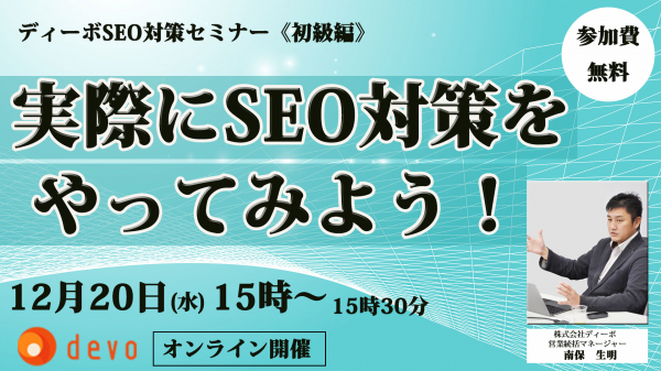 SEO対策サービスの開発・販売を行っている株式会社ディーボ(札幌市、代表取締役社長:藤沢 竜志、以下:ディーボ)は、2023年12月20日(水)15時からSEO対策セミナー《初級編》を開催します。