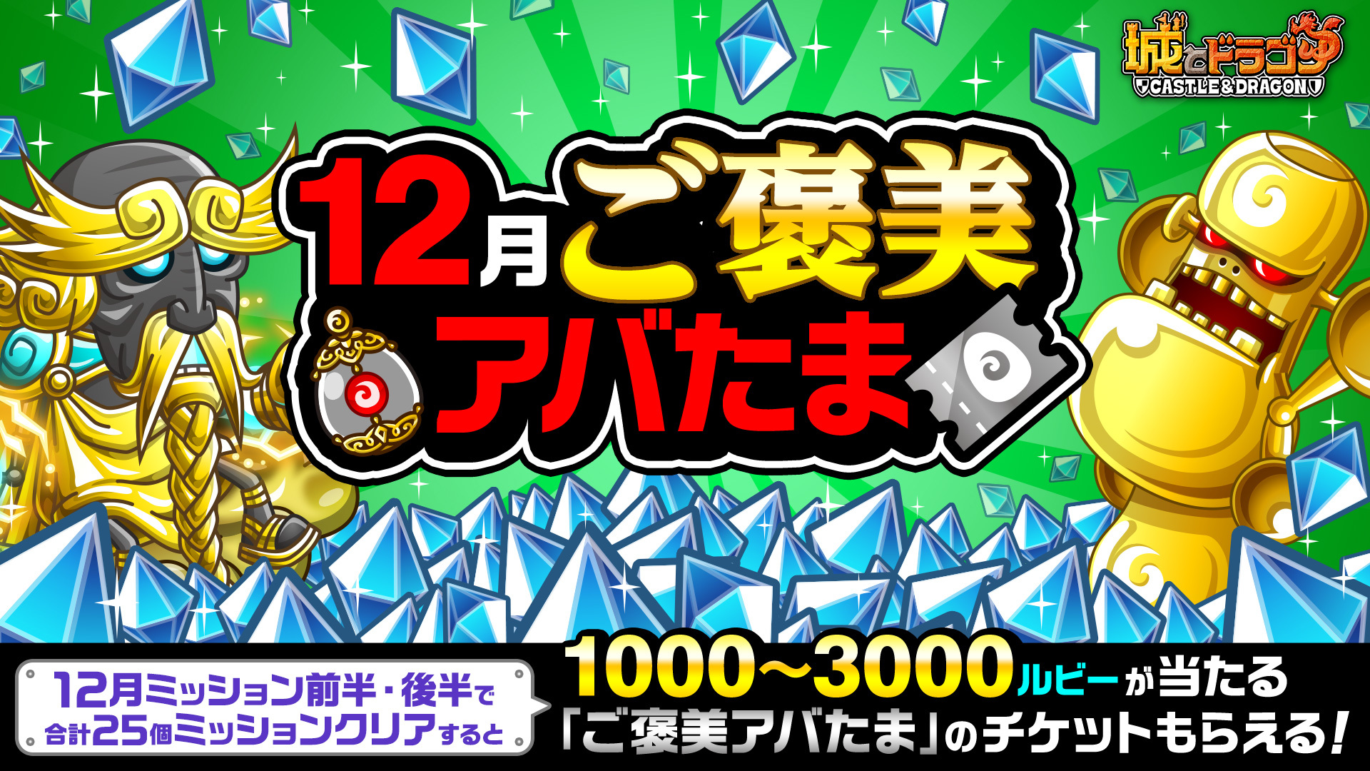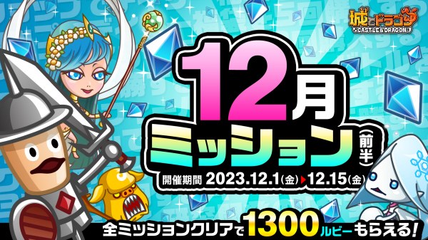 株式会社アソビズム(本社:東京都千代田区、代表取締役:大手智之)は、App Store・Google Playにて好評配信中の『城とドラゴン』で、「12月ミッション(前半)」を2023年12月1日(金)より開催いたします。