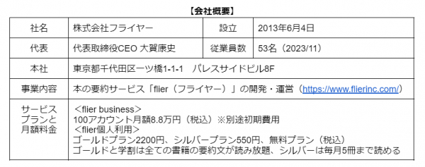 株式会社フライヤーは、本の要約サービス「flier(フライヤー)」を運営する、ITベンチャー(2013年6月設立)です。最大の特長は「書評(レビュー)」ではなく「要約」である点です。書き手の主観が入る書評とは異なり、著者の主張や論理(重要ポイントや全体像)を忠実にまとめ、読者に伝えます。書評でないため、出版社と著者から要約の許可を得る必要があり、要約した原稿にも目を通していただくことで、高品質なサービスを提供しています。