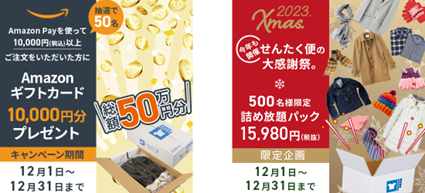 宅配クリーニングサービスの『せんたく便』を運営する株式会社ヨシハラシステムズ(本社:滋賀県彦根市、代表:吉原 保)は、先着500名様限定で詰め放題パックキャンペーンと、キャンペーン期間中に1万円以上購入の方の中から抽選で50名様に1万円分のAmazonギフト券があたるプレゼントキャンペーンを、2023年12月1日から12月31日まで、同時開催します。