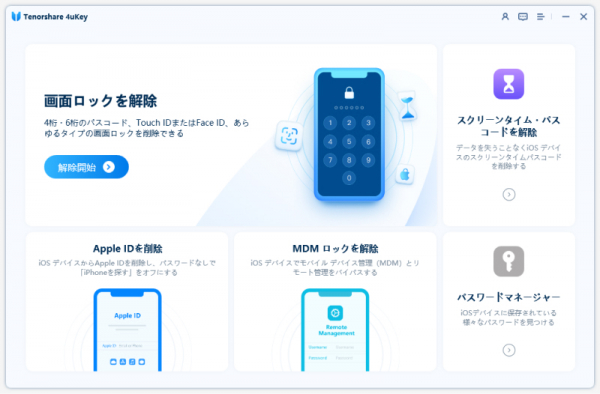 もし強制再起動が効果がなかった場合、4uKeyというソフトウェアを使用してiPhoneの画面ロックを解除することができます。以下の手順で行います。