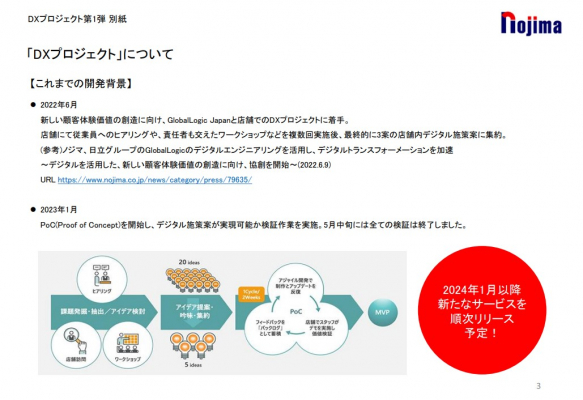 株式会社ノジマ(神奈川県横浜市、代表執行役社長:野島廣司/以下、ノジマ)は、株式会社日立製作所(東京都千代田区、執行役社長兼 CEO:小島啓二/以下、日立)と、日立の米国子会社でデジタルエンジニアリングのリーディングカンパニーであるGlobalLogicの日本法人、GlobalLogic Japan 株式会社(東京都千代田区、CEO:ニテッシュ・バンガ/以下、GlobalLogic Japan) との協創による「DXプロジェクト」にて開発した技術を用いて、2023年12月7日(木)より、新たな顧客サービスの提供を開始いたします。