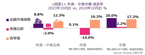 外食・中食市場の2023年10月は、売上8.8%増(2019年同月比)