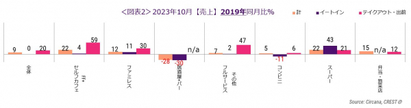 業態別・利用形態別の2023年10月の売上2019年同月比をみると(図表2)、外食・中食全体のイートインは0.1%増と、前月より9.3ポイント増で大幅に回復。テイクアウト・出前は同20.0%増で、ファストフード+セルフサービスカフェ(同59%増)、その他フルサービスレストラン(同47%増)が好調でした。