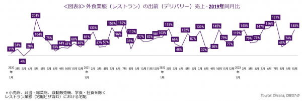 外食業態計(レストラン計)の出前(デリバリー)売上2019年同月比をみると(図表3)、プラス成長が続いています。デリバリー増加のピークは2020年5月の204%増ですが、その後も2ケタ増が続いています。2023年10月は同145%増で、3ヶ月ぶりに3ケタの成長でした。