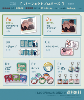 背景が透明なデザインで置く場所により雰囲気が変わるS賞アクリルブロックとA賞のクッションは描き下ろしイラストを使用!またその他のデザインもコミックスから胸キュンシーンを厳選しており、二人の世界観を存分にお楽しみいただけます!