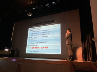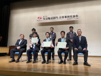 当社の生活物流部門は、日々の業務品質向上を目的とし、毎年、改善事例発表会を開催しています。今年の改善活動のテーマは『労働時間削減と定着率向上』。生活物流部門全 74 営業所の中から、改善率上位などの選考基準によって選ばれた9営業所長が様々な取り組みについて発表しました。各営業所長が独自の工夫を凝らしたプレゼンをおこない、接戦の末、豊中営業所所長の工藤憲治(くどうけんじ)が優勝しました。
