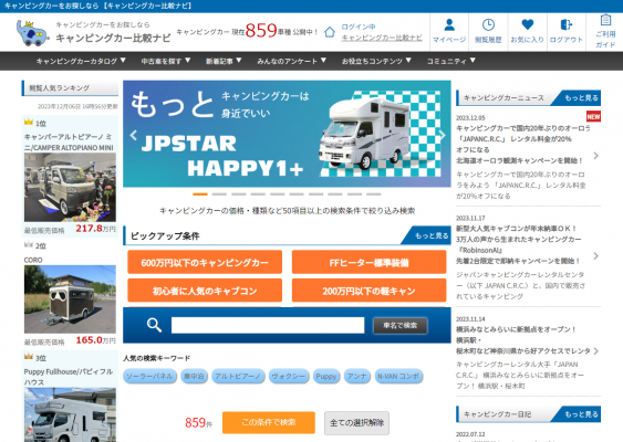 当サイトは、これからキャンピングカーの購入を検討されている方へ向けた日本最大級のキャンピングカーの比較サイトです。国内・海外を含む850台以上のキャンピングカーを、価格や車両サイズ、就寝人数やオプション装備など、約60種類の項目からスペック比較ができ、どのキャンピングカーが人気かを一定期間の閲覧数を基にランキング形式で表示。