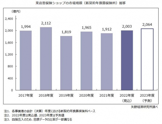 来店型保険ショップ経営企業では、従来よりも保障が手厚く保険料が安い医療保険や、一時払い終身保険や米国金利の高騰で注目される外貨建て保険に対する相談が増加した。そうした保険商品への加入が進んだことから、2022年度の来店型保険ショップの市場規模(新契約年換算保険料)は前年度比4.8%増の2,003億円の見込みである。