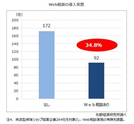 来店型保険ショップでは、コロナ禍をきっかけにWeb相談の導入が進んでいる。2023年8月現在、来店ショップ経営企業264社のうち、92社(34.8%)がWeb相談を導入していた。2022年の前回調査では、約30%の企業がWeb相談を導入していたので、この一年間で約5ポイント拡大している。