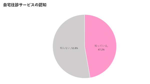 調査結果から、自宅往診サービスの認知率は約47%であり、受診の必要性が発生する前から認知している人が9割以上ということがわかった。実際に利用したことがある人は4%と少ないものの、利用した人のリピート志向は6割と過半数を超えている。