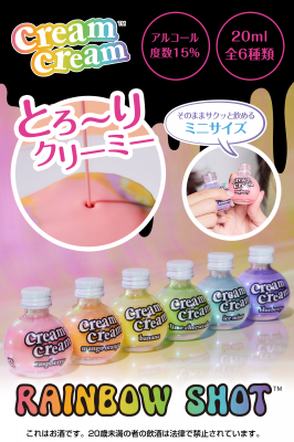 容量20ml、アルコール度数15%でそのままショット感覚で飲めるとろ~りクリーミーな次世代クリームリキュールです。目を引くキュートなフォルムで可愛らしい小瓶を採用いたしました。フレーバーはラズベリー、マンゴーオレンジ、バナナ、ライムチーズケーキ、アイスミント、ブルーベリーの6種類展開です。小瓶を並べると虹色に彩る「レインボーショット」は華やかで写真映え間違いなし。みんなと飲み比べも楽しめます。