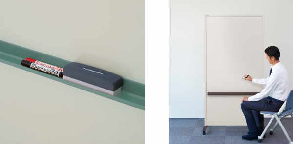 省スペース型の縦長形状。座ったままでも書き込みしやすく、ミーティングがスムーズに進行できます。スチール鋼板なのでマグネットによる掲示も可能な両面ホワイトボード仕様です。