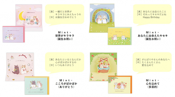 猫の作品で人気のイラストレーター・たたメーピーが手がけるカードシリーズが新登場! いつも頑張るあなたに、ミント色の瞳がチャームポイントの三毛猫・Mint(ミント)が優しい言葉をかけてくれます。
