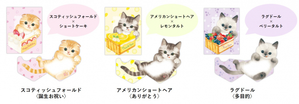 人気の猫種とスイーツを組み合わせたキュートなミニカード「食いしん坊猫」が登場! リアルタッチで描かれたふわふわの猫が新鮮なデザイン。猫好きさんへのメッセージにイチオシです◎