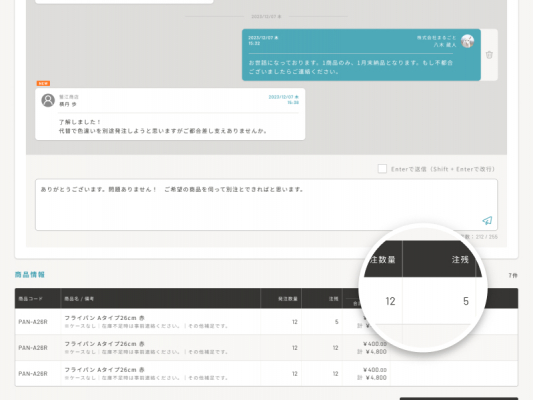 取引ごとにメッセージ欄を用意しています。発注側・受注側が同じ注文情報を見ながらチャットできるので、認識ずれや行き違いの心配がありません。