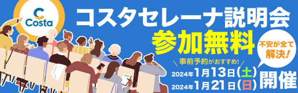 今月12月に開催いたしました金沢・東京の2会場での2024年6月出発コスタセレーナ説明会が大盛況であったため、来月1月も同じく金沢・東京の2会場にて開催することとなりました。参加費は無料で事前にご予約いたくだことでご参加いただけます。開催概要は下記のとおりです。
