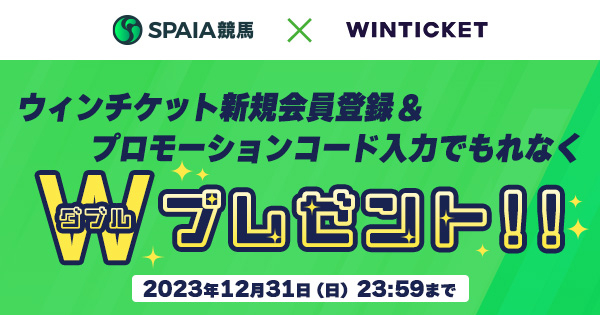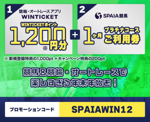 キャンペーン期間中に「 WINTICKET 」( https://www.winticket.jp/ )に新規会員登録の上、新規会員登録から7日以内に「 WINTICKET マイページ」からプロモーションコード「 SPAIAWIN12 」を入力したお客様にもれなく、「 WINTICKET ポイント」1,200ポイントと「 SPAIA競馬プラチナ利用券」を進呈いたします。