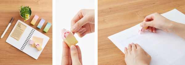 本体は紙のケースで覆われているため、触り心地が優しく、これまでにない多様なデザインも施せるようになりました。環境面だけではなく、思わず集めて机に並べたくなるような、おしゃれでかわいいデザインのテープのりです。