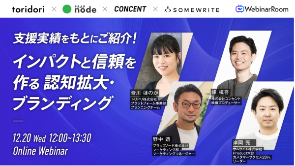 ビジネスマンの役に立つ動画がいつでも無料で観られるウェビナープラットフォーム「Webinar Room(ウェビナールーム)」(https://webinar-room.net/)を運営する株式会社ヒトクセは、2023年12月20日(水)12:00~ 株式会社トリドリ、プラップノード株式会社、サムライト株式会社、株式会社コンセントとの「支援実績をもとにご紹介!インパクトと信頼を作る認知拡大・ブランディング」を開催します。