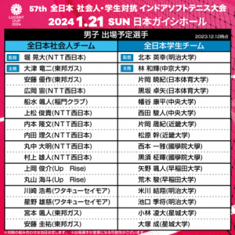 2023年12月1日(金)、株式会社ルーセント(本社:千葉県柏市、代表取締役社長:中野吉広)は特別協賛する大型ソフトテニス大会「ルーセントカップ 第57回全日本社会人・学生対抗インドアソフトテニス大会」の観戦チケット販売を開始しました。また、同月18日(月)、大会出場選手が決定し、愛知県ソフトテニス連盟の公式サイトで公開されました。