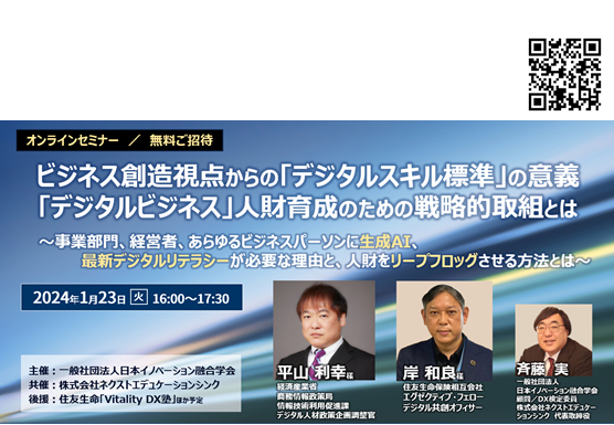 当日は講師として、住友生命のデジタル共創オフィサーとして、DXビジネスをリアルに推進・普及に向けて活動されている岸和良様と、「デジタルスキル標準」の策定を推進されている経済産業省 平山利幸様に、あらゆるビジネスパーソンに生成AI、最新デジタルリテラシーが必要な理由と、人財をリープフロッグさせる手法、「デジタルスキル標準」におけるビジネス創造人財の育成が急務である点についてお話いただきます。