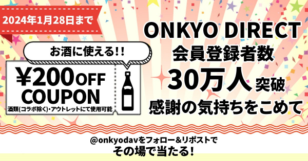 当社は、ONKYO DIRECT会員登録者数30万人突破を記念したキャンペーンを本日2023年12月25日から実施致します。ONKYO DIRECTのXアカウント(@onkyodav)をフォローしていただき、対象ポストをリポストしていただくと、クーポンをプレゼント致します。