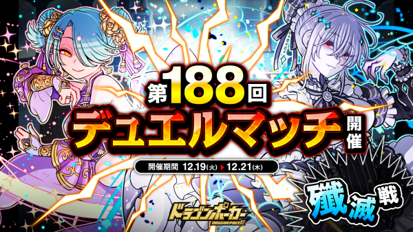 株式会社アソビズム(本社:東京都千代田区、代表取締役:大手智之)は、App Store・Google Playにて好評配信中のリアルタイム合体カードバトル『ドラゴンポーカー』で、2023年12月19日(火)より「第188回デュエルマッチ本戦」を開催いたします。