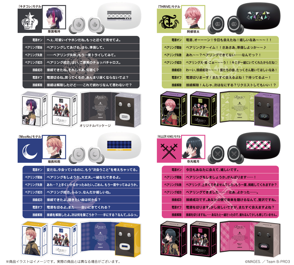 本コラボレーションモデルは、充電ケース天面に「各ユニットの衣装モチーフ」を印刷加工、左右ハウジングに「各ユニットのロゴ」をレーザー加工。ハウジングは起動時にLED点灯します。搭載音声ガイダンスは各ユニットより、それぞれ1キャラクターのボイスを搭載。電源オンやオフ、ペアリング時やタップ音等、計11ワードの内容となっており、パッケージは搭載音声ガイダンスキャラクターの描き下ろしイラストデザインとなっております。