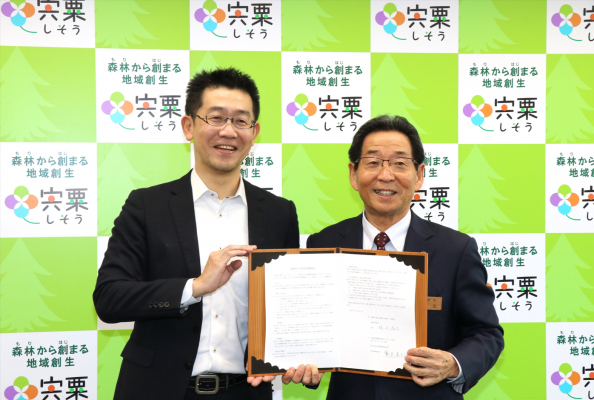 そのような中、「宍粟市営業部」の取り組みの一環として、宍粟市の様々な課題解決や持続的発展寄与につながる官民連携の事業化に向け、両者で検討を重ね、より一層効果的に取り組みを進める為に、「森林(もり)まち宍粟包括連携協定」を締結する運びとなりました。