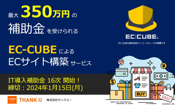 株式会社サンクユー(東京都品川区、代表取締役社長:堀川治)は、2023年12月25日、最大350万円のIT導入補助金の交付申請が可能な「EC-CUBEによるECサイト構築」16次締切分を開始いたします。