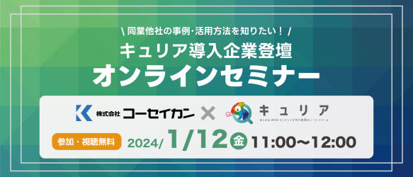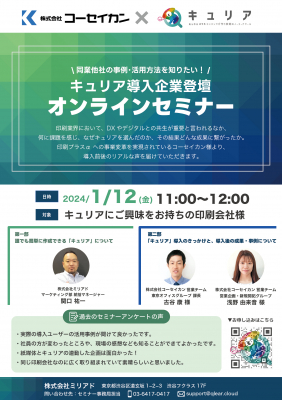 スマホコンテンツ制作ツール「キュリア」を運営する株式会社ミリアド(本社:東京都渋谷区、代表取締役CEO:樋口 清政)は、2024年1月12日(金)AM11時から、印刷業界向けに 【キュリア導入企業 登壇セミナー】と題して、株式会社コーセイカン(本社:岡山県倉敷市)にご登壇いただく無料オンラインセミナーを開催することをお知らせいたします。