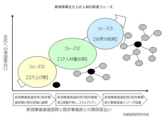 新規事業を基軸に中核となる人材の育成については、調査結果概要(前述)で提示した指標(図.「新規事業立ち上げ人材の育成フェーズ」参照)をベースに、立ち上げ期、コア人材輩出期、自律分散期といった3つのフェーズ(段階)を通じて全社的な取り組みへと拡充していく必要があるものと考える。