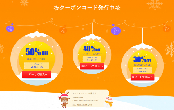 クリスマスと新年を迎えに、EaseUS Software Co., Ltd.は2023年12月21日(木)から2024年1月5日(金)まで、最大60%OFFの特別セールを開催します!これは年に一度の最大セール、ぜひお見逃しなく!イベントページ:https://reurl.cc/77Xk11