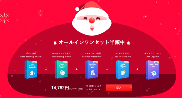 【EaseUS Data Recovery Wizard】+【EaseUS Todo Backup Home】+【EaseUS Partition Master】+【EaseUS Todo PCTrans】+【EaseUS Disk Copy】の オールインワンセット1年間ライセンスと永続ライセンスは半額!