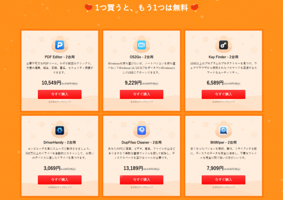 PDF編集ツール、ポータブルWindows作成ツール、プロダクトキー回復ツール、ドライバー修復ツール、重複ファイル削除ツール、データ消去ツールのいずれかを1つ購入すると、もう1つは無料で手に入れることができます。