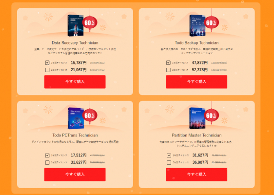 最後に、データ復旧、バックアップと復元、パーティション管理、PCデータ移行といった4つのツールのTechnician版(企業版)が60%オフとなる大変お得なセールを行っております。