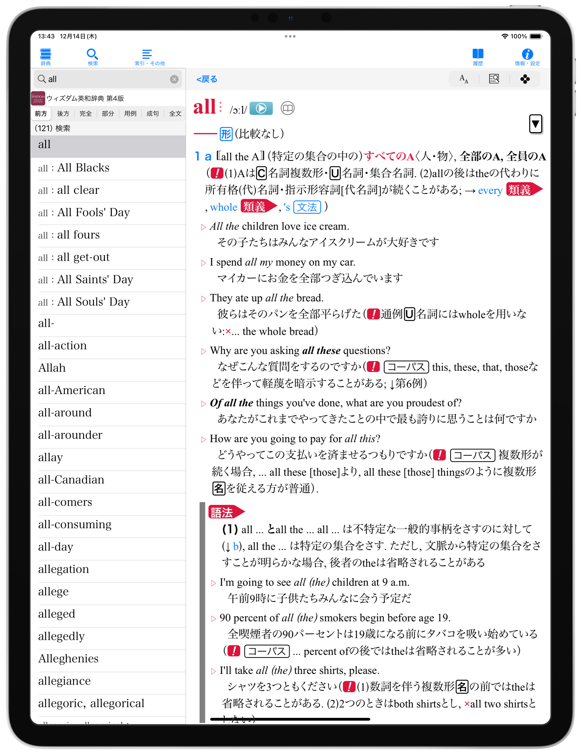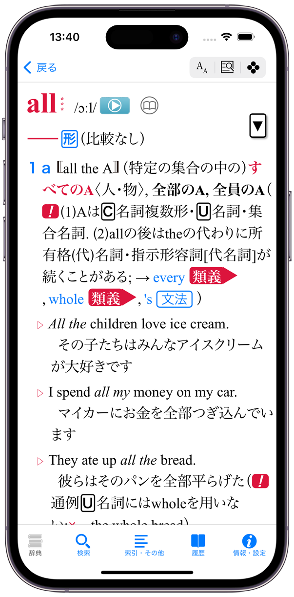 それぞれの検索方法で、文字を入力すると候補見出し語が表示されるインクリメンタルサーチに対応(部分一致/全文検索/用例検索/成句検索/複合語・成句検索/基本文型検索を除く)
