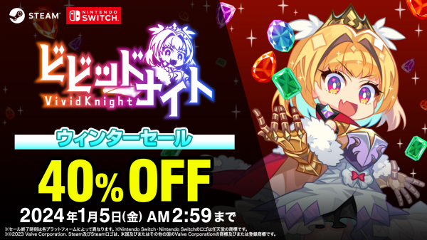 株式会社アソビズム(本社:東京都千代田区、代表取締役:大手智之)は、日本時間2023年12月22日(金)より、Steamおよびニンテンドーeショップにて『ビビッドナイト』が40%OFFになるウィンターセールを開催していることをお知らせいたします。
