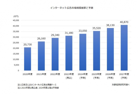 2023年度は、これまで景気を押し上げてきたコロナ禍明け後の需要回復がほぼ一巡したと考えられ、景気回復は緩やかなペースとなった。インターネット広告市場は引き続き成長するものの、2023年度の同市場規模は前年度より伸長率が鈍化し、前年度比106.3%の3兆1,180億円を見込む。