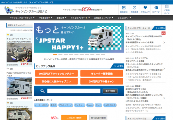 当サイトは、これからキャンピングカーの購入を検討されている方へ向けた日本最大級のキャンピングカーの比較サイトです。国内・海外を含む850台以上のキャンピングカーを、価格や車両サイズ、就寝人数やオプション装備など、約60種類の項目からスペック比較ができ、どのキャンピングカーが人気かを一定期間の閲覧数を基にランキング形式で表示。