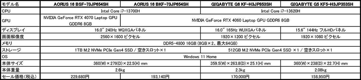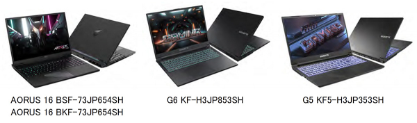 セール対象製品は、ミドルクラス向けゲーミングノードPC「AORUS 16」2モデルと、エントリー向けゲーミングノートPC「G6」1モデルおよび「G5」1モデルの計4製品。セール対象製品のモデル名と特価販売価格は以下のとおりです。なお、各モデルとも在庫がなくなり次第、期間中であってもセールを終了いたします。