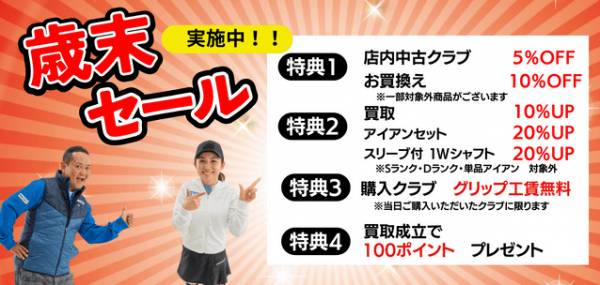株式会社ゴルフ・ドゥ(本社 さいたま市 代表取締役社長:佐久間功)は、「ゴルフドゥ!」24店舗において、「歳末セール」を2023年12月31日(日)まで実施中です。「日頃のご愛顧への4大恩返し」と題して、買換えが特にお得になる企画を中心に、ゴルファーの皆様に喜んでいただけるような今年最後の企画を用意しました。