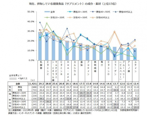 健康食品(サプリメント)の摂取者(20代~70代以上の男女1,421名)に対して、現在摂取している健康食品の成分・素材を尋ねた。