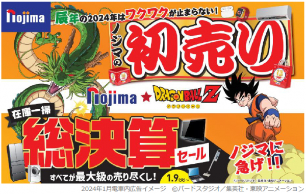 メーカー販売員のいない唯一の家電専門店である株式会社ノジマ(神奈川県横浜市、代表執行役社長・野島廣司)は、2024年1月1日(祝)より全店舗で開催される初売りセールで、「辰(龍)年」にちなんだ企画として、小売業界初、老若男女・国内外問わず多くの方に愛され続けている「ドラゴンボールZ」とのコラボレーションを実施いたします。今回のメイン企画として、7つ集めると願いが叶うという”ドラゴンボール”にちなんだ7大特典をご用意。福袋や特別価格商品、「旅行券」・「大人気家電」・「ドラゴンボールZ×ノジマ 限定コラボステッカー」などがあたる大抽選会など、ワクワクとおトクが詰まった新年最初の楽しいお買い物体験をお届けいたします。